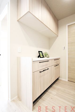 室内は、約14.8帖の広々としたLDKを中心に、南西向きの明るい陽光が差し込む設計となっています。キッチンは家事効率を高める食洗機や浄水器を備えたシステムキッチンを採用しており、背面には便利なカップボードや食器棚として使える収納も完備されています。特筆すべきは、独立した「ドライルーム(洗濯乾燥室)」が設けられている点で、室内乾燥機を搭載しているため、天候を気にせず効率的に洗濯物を干すことが可能です。