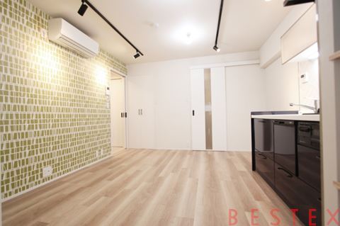 内装デザインにもこだわり、居室やキッチンには落ち着いた雰囲気のアクセントウォールを配したほか、スタイリッシュなダクトレールライトを追加し、洗練された空間を演出しています 。また、フローリングの上張りやクロスの貼り替え、建具の刷新も行われており、清潔感あふれる住まいとなっています 。