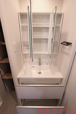 三面鏡仕様の独立洗面台を完備しており、整理整頓もしやすくなっております。