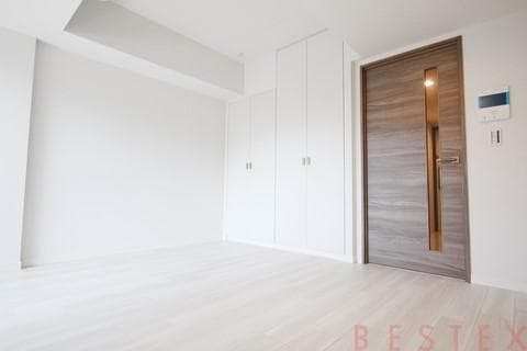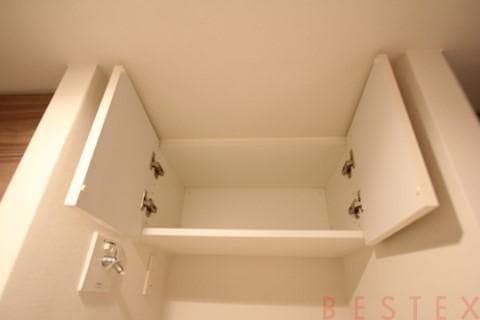 部屋のドアの隣に収納棚が2つついています。右側の棚はかなり背が高く、天井近くまで高さがあります。収納力抜群です♪