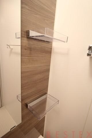 鏡の右横に透明なラックが設置されています。シャンプーやカミソリや洗顔料など、入浴中に使用する雑貨や小物を置けますね♪
