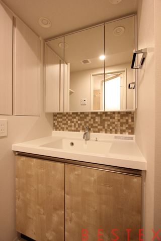 洗面台は独立タイプで三面鏡仕様、収納場所もゆとりがあり申し分ないです。