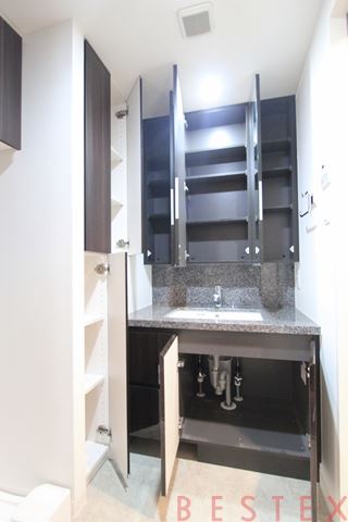 三面鏡仕様の独立洗面台で収納スペースもしっかりと確保されております。