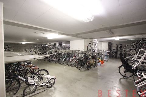 エントランス向かって左手のスロープを降りていただくと、駐輪場がございます。