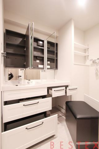 三面鏡仕様で収納スペースはもちろん備え付けの椅子があるので、座りながら身支度ができるのもポイントです。