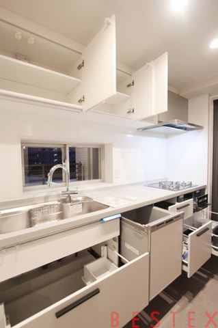 3口ガスコンロキッチンのキッチンで調理スペース・収納スペースも十分に確保されており、食洗機付きと設備充実です。