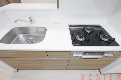 リビングダイニングは開放感のある設計で、家具配置がしやすい整形タイプ。対面式のカウンターキッチンを採用し、空間に一体感をもたらします。3口ガスコンロ付きで同時調理もスムーズ。さらに食洗機を備えており、日々の家事負担を軽減します。お料理好きの方にもご満足いただける充実のキッチン設備です。