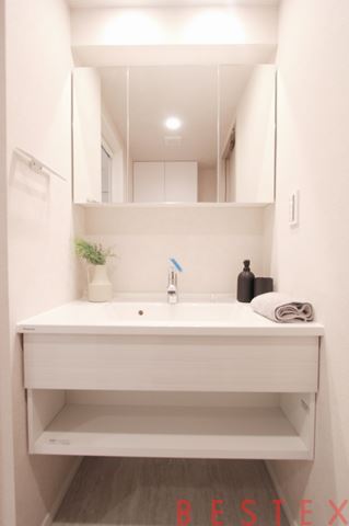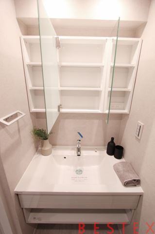 三面鏡仕様の独立洗面台で化粧品や日用品の小物も整理整頓できます。